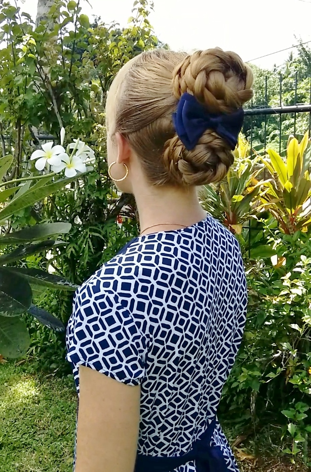 I hope you have a beautiful, safe weekend. I have a new hair bow that would just match my dress, so I fixed my hair in two braids. Then I wrapped each braid up into a bun and pinned them in place with bobby pins and tiny hair clips. I put my navy blue bow in the middle of my two buns, and my hairstyle was finished and ready for pictures. How lovely to have such a nice flower background right in my own front yard.